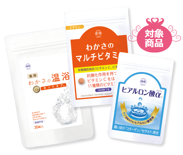 内側からうるおいを満たす『ヒアルロン酸α』、バランスを整える『わかさのマルチビタミン』、外側からやさしく包み込む『わかさの温浴』が入った特別限定セット♪