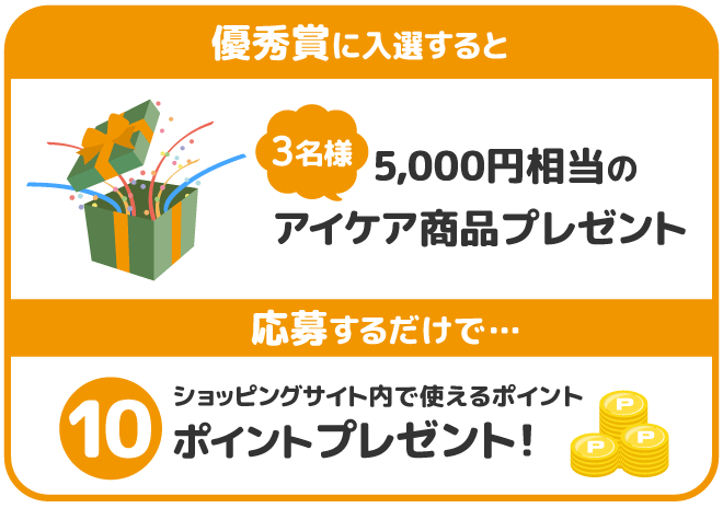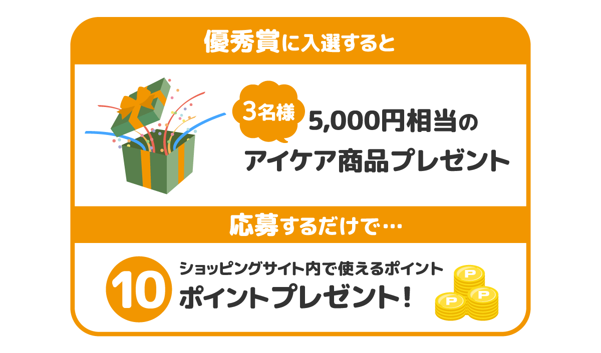 2.結果発表 | 優秀賞3名様には、5,000円相当の「アイケア商品の詰め合わせ」をプレゼント! 入賞者には後日メールでお知らせいたします。 ※参加賞として応募者全員にわかさ生活ショッピングサイト内で使えるポイント10ポイントプレゼント。 ※結果発表は当ページにて発表いたします。 結果発表:2025年11月7日(金) |
