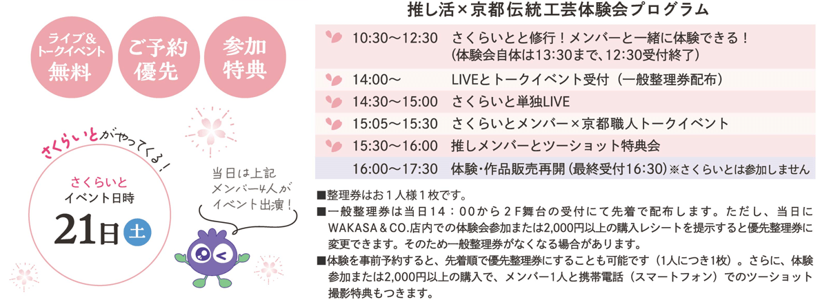 優先整理券は21日(土)14:00までに舞台2Fの受付にてお手続きをお願いします。対象は21日14:00までの伝統工芸体験とWAKASA&CO.店内の2,000円以上お買い上げレシートです。