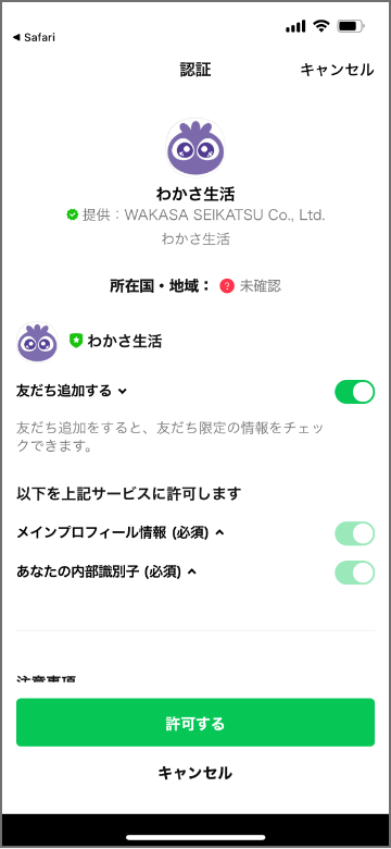 わかさ生活LINEの認証画面にて 「許可する」をご選択ください。