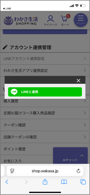 わかさ生活SHOPPINGのマイページにある「LINEアカウント連携設定」から「LINEと連携」を押す